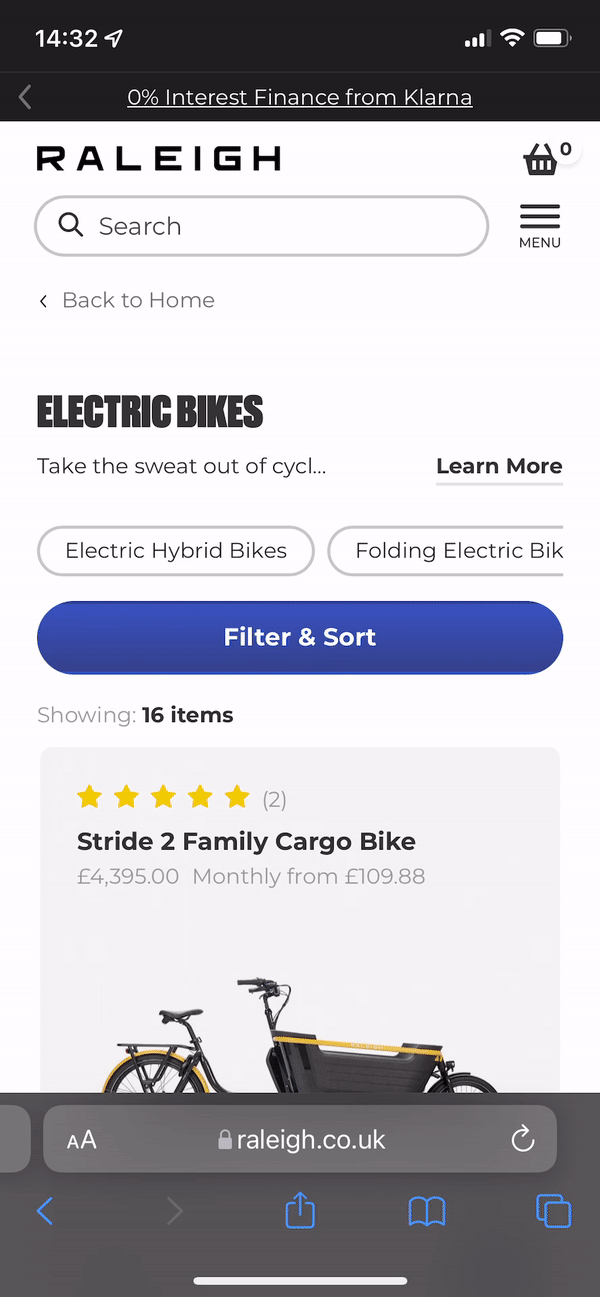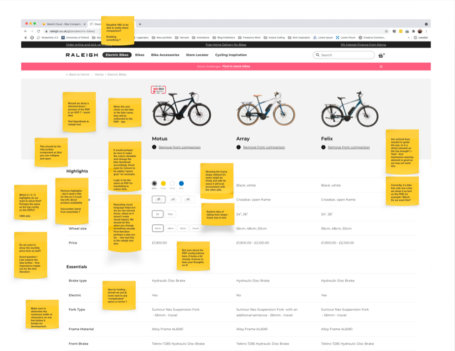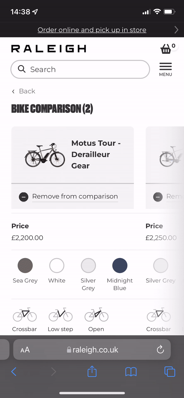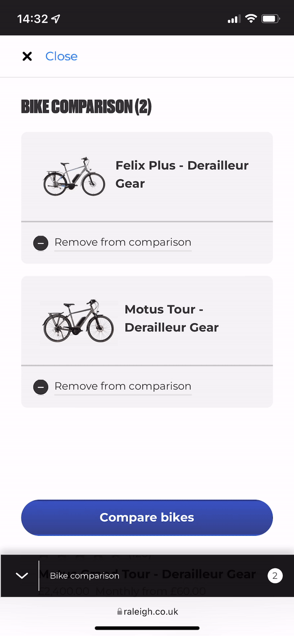 The biggest challenge we faced was with making the comparison function and display in the most user friendly way on mobile. After we had put together our initial prototypes and after multiple iterations we were ready to test. We were going to launch the feature with Raleigh, one of our core brands from the UK. After testing with our stakeholders at Raleigh we were ready to make some minor changes and launch the feature.